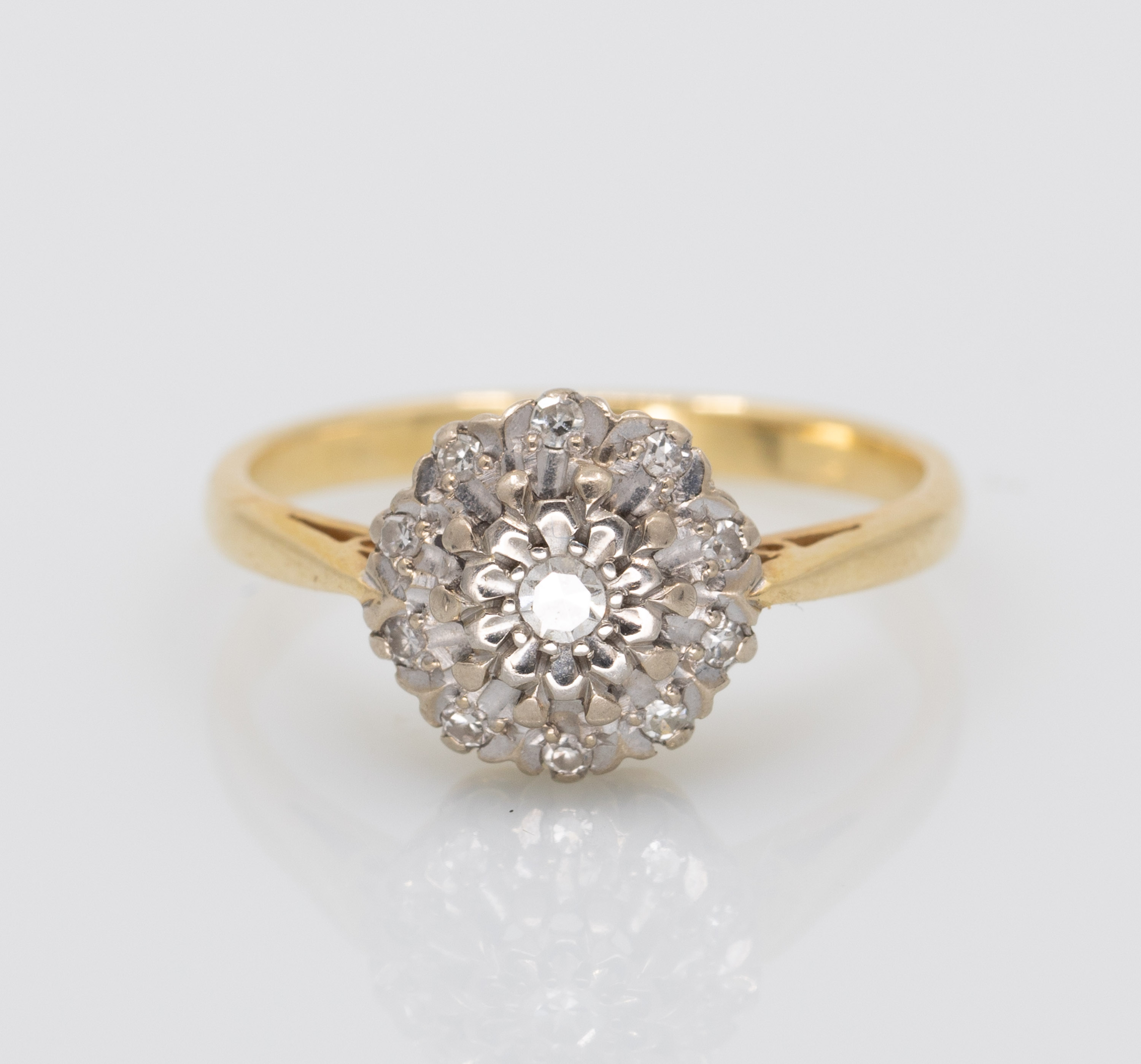 14 krt., centraal een briljant, 0.15 ct., daaromheen 8 robijnen, maat 17.