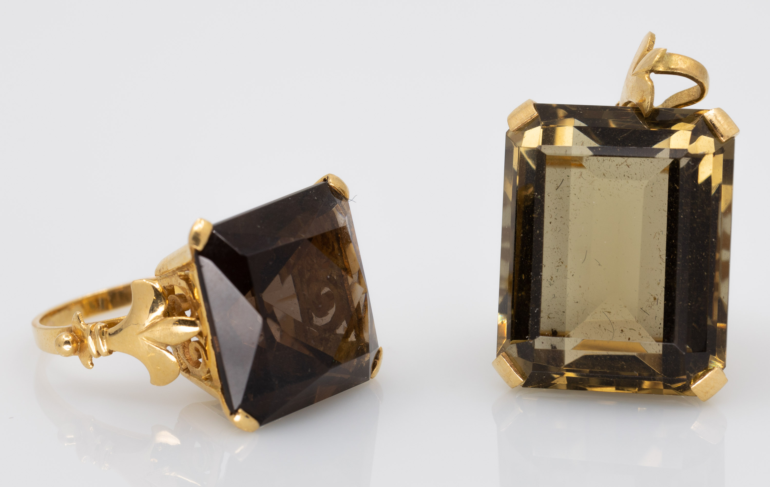 20 krt., rookkwarts beide in deels opengewerkte zetting met krulmotieven, ring met facet geslepen rookkwarts, maat 16.75, hanger met emerald geslepen rookkwarts, l. 2.5 cm.