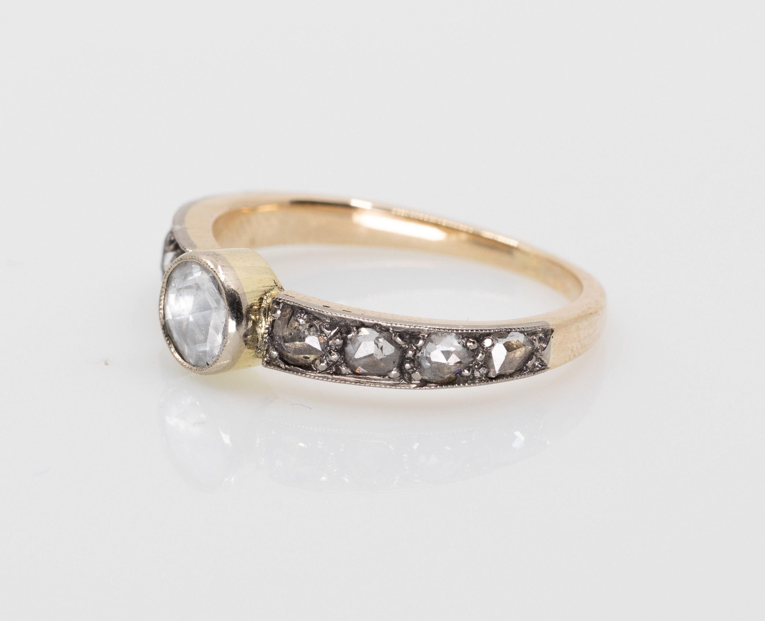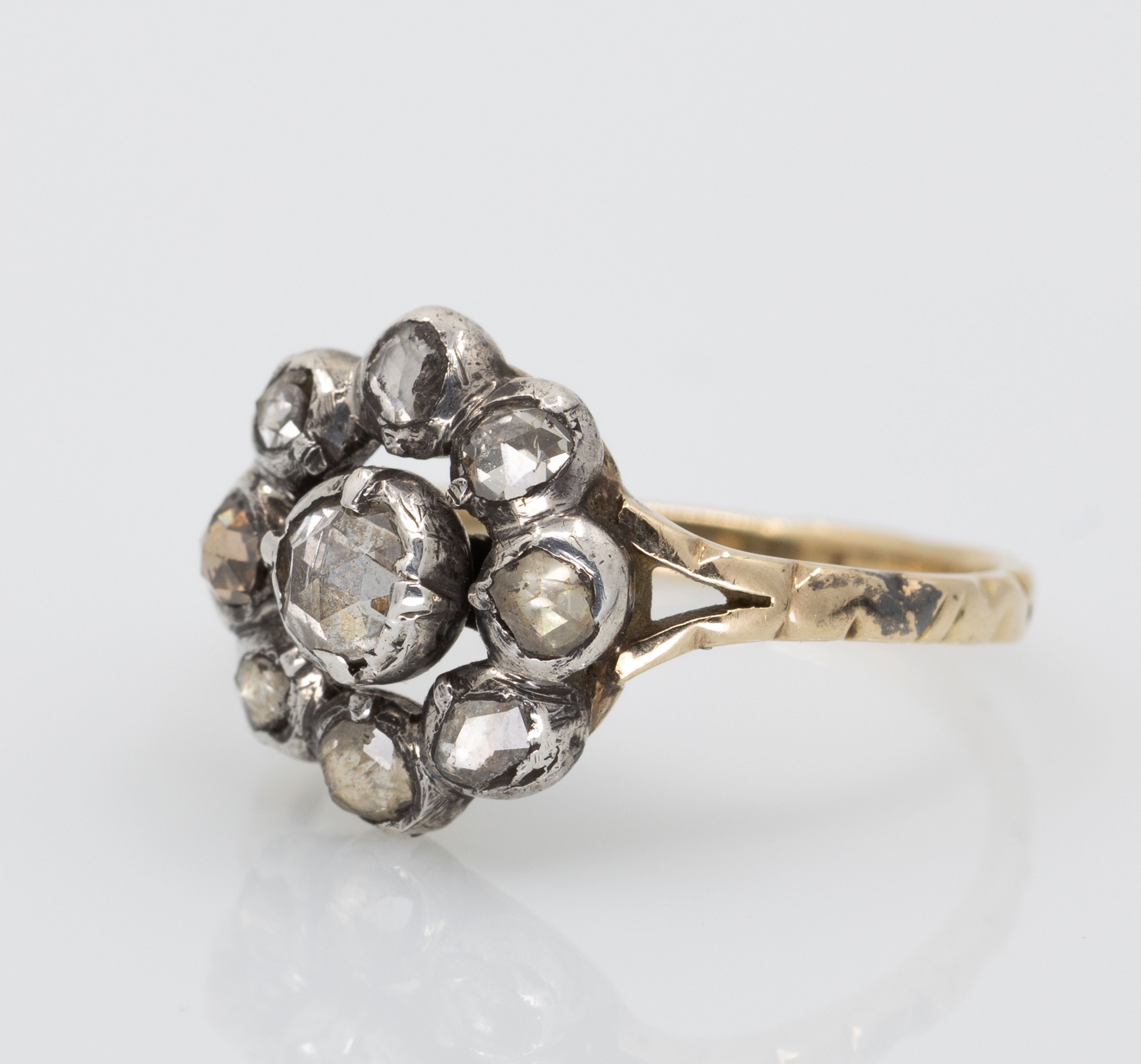 14 krt. en 2e gehalte, bezet met een grote en daaromheen 8 kleinere roosgeslepen diamantjes, ca. 0.70 ct., maat 17.5.