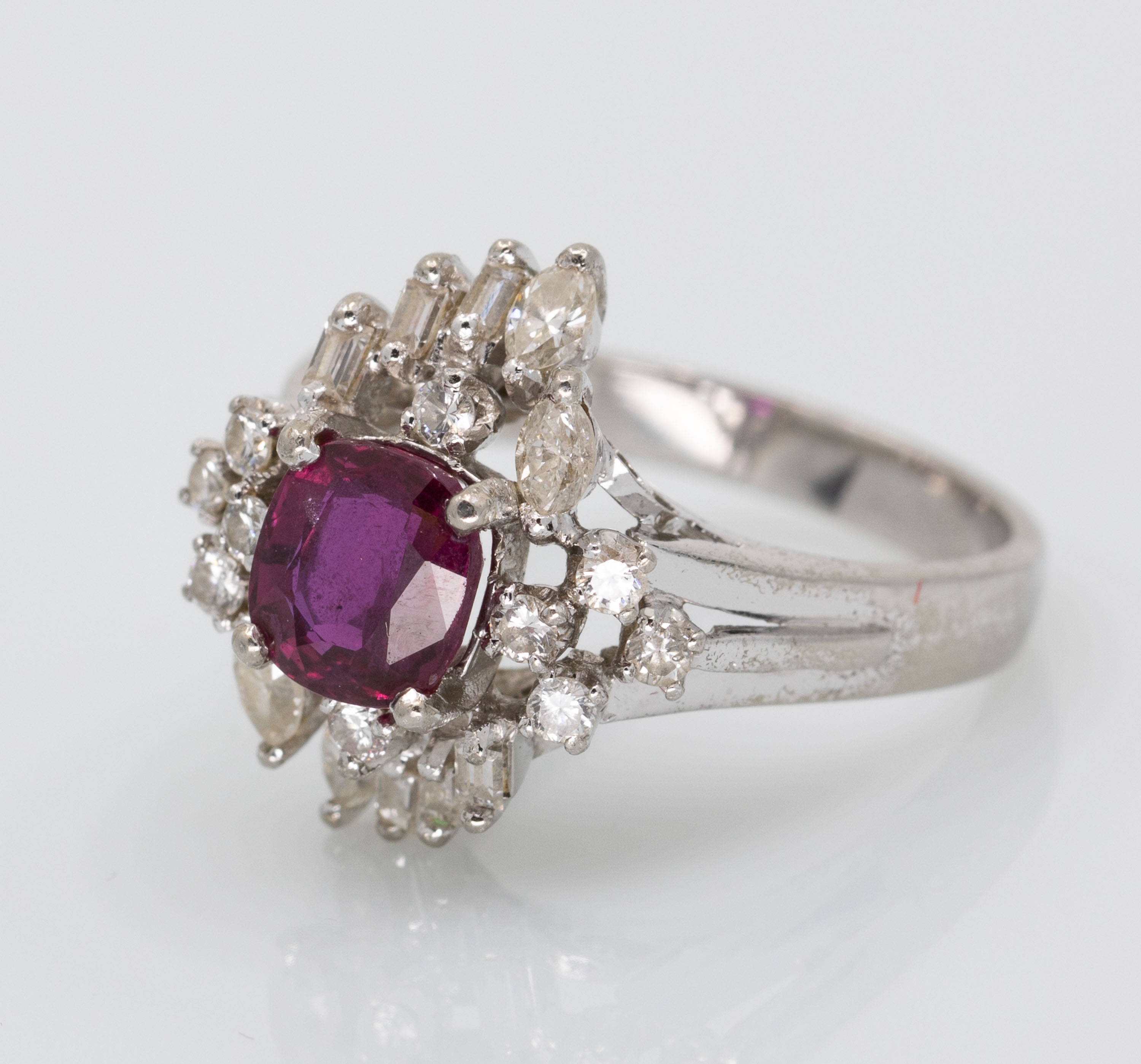 900/1000 platina, centraal een facet geslepen grote robijn, daaromheen briljant en markies geslepen diamanten, maat 17.