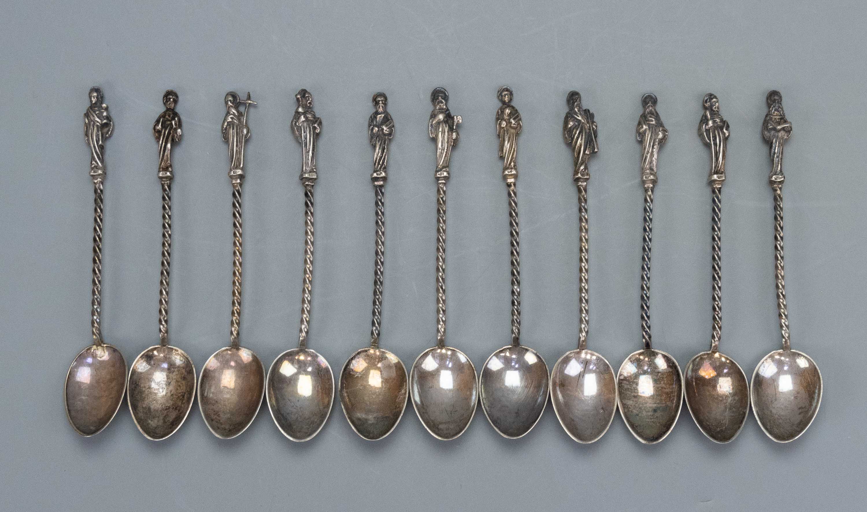2e gehalte zilver met gedreven Oudhollands decor in cartouches omringd door florale motieven, daarbij een serie van zes lepeltjes en een niet bijbehorend suikerschepje.