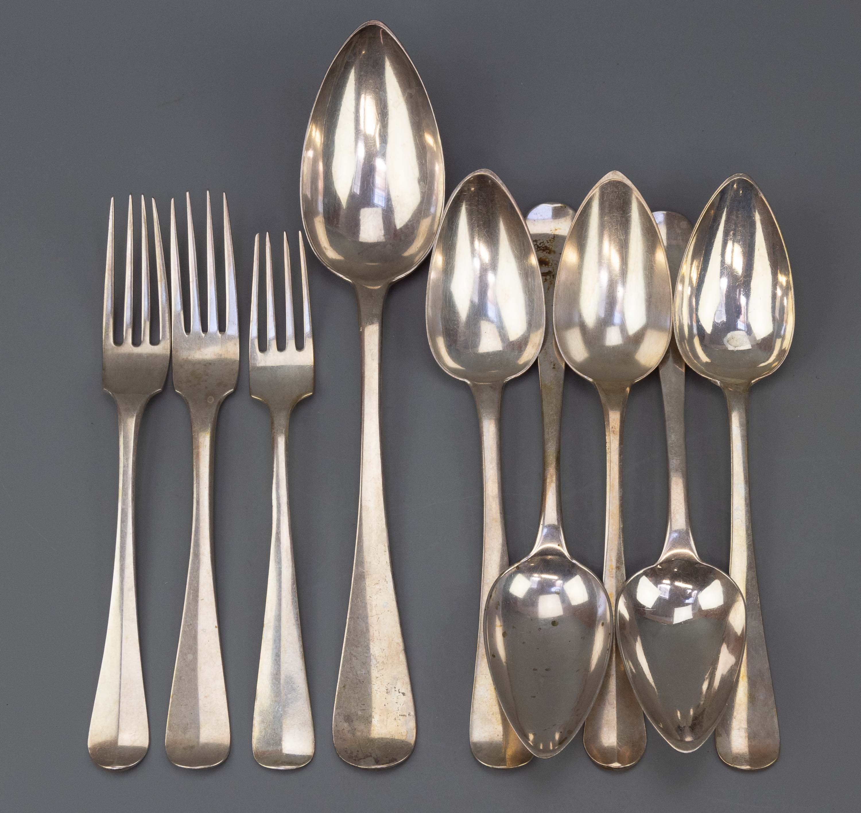 2e gehalte, Haags lofje, 11 vorken en 12 lepels, - enkele tanden sleets.