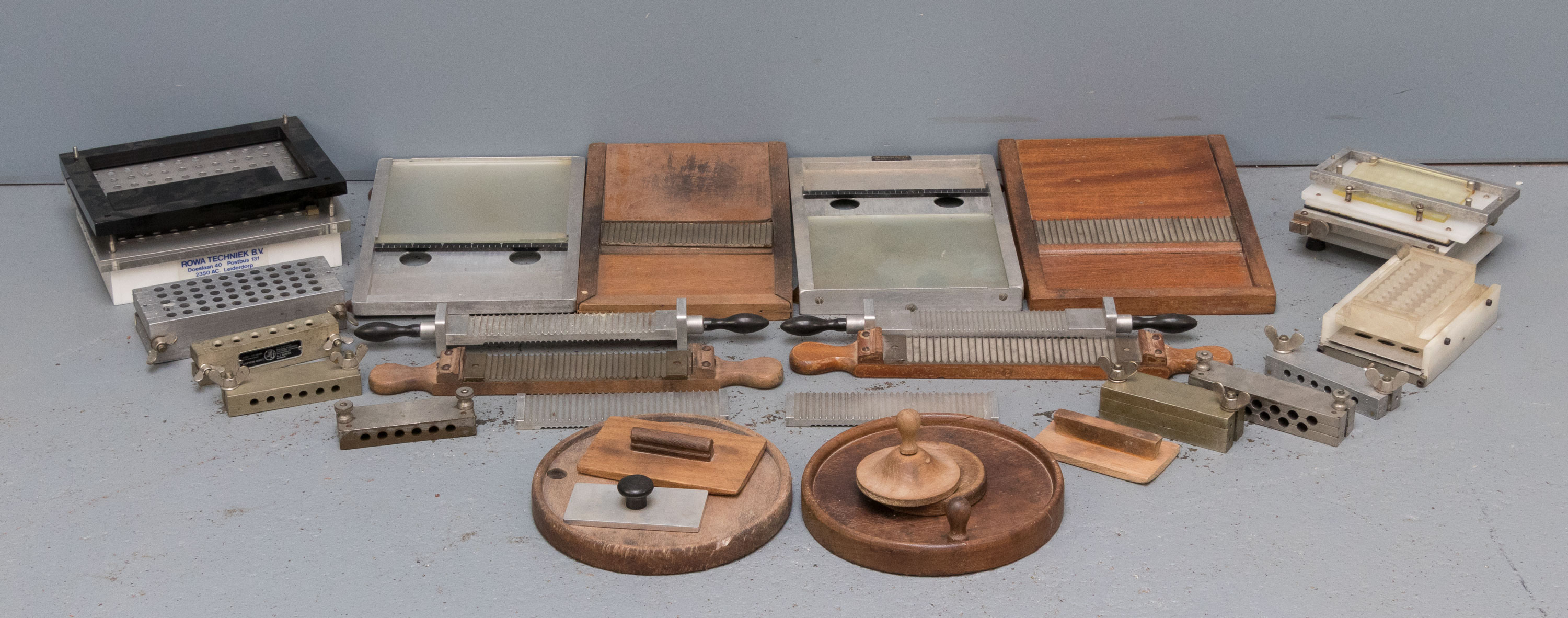 Glazen plaatjes in diverse formaten, w.o. enkele exemplaren met beschadigingen, daarbij een defecte toverlantaarn - lens ontbreekt, dient gereviseerd te worden.