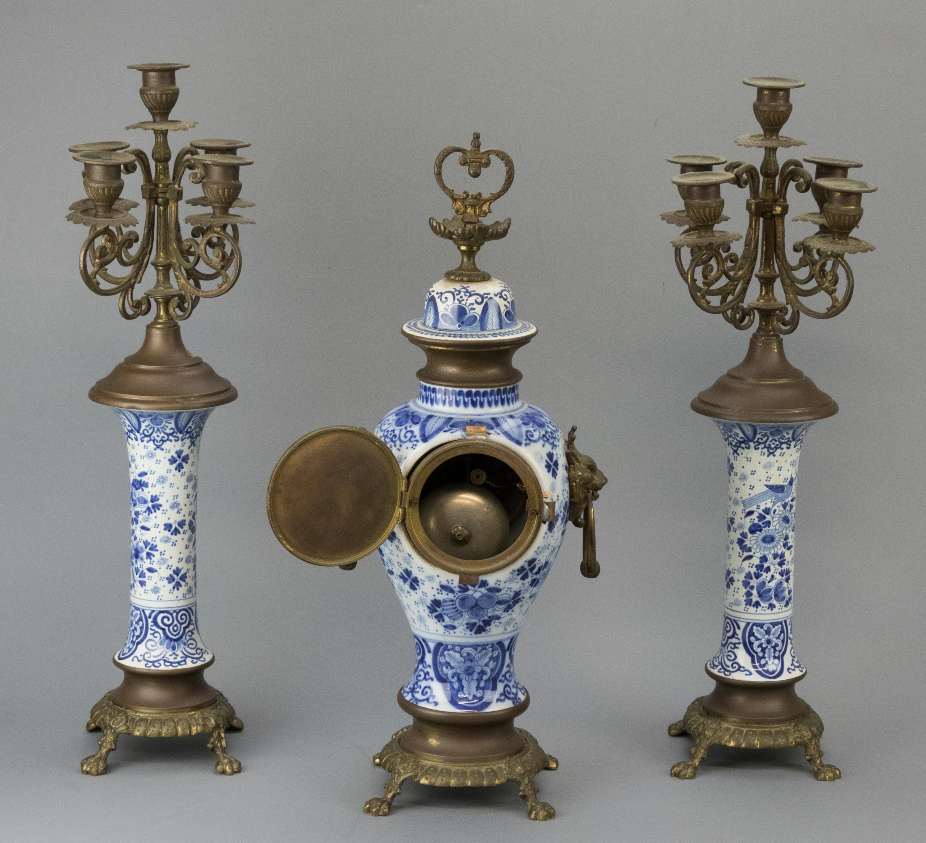 Porselein, aardewerk en koper, vaaspendule geflankeerd door een paar 5-lichts kandelabers, h. 46.5 - 49.5 cm.