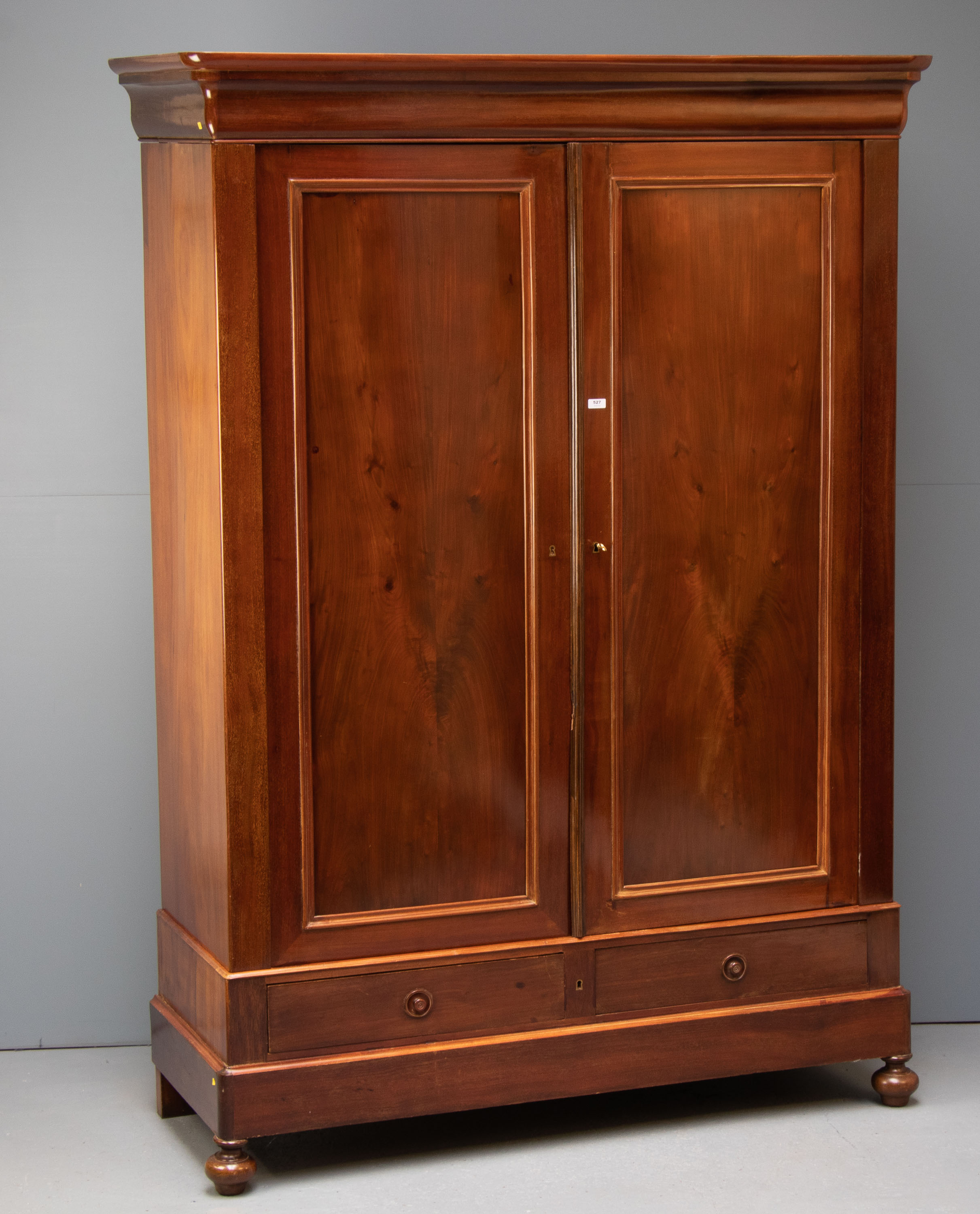 Mahoniehout, voorzien van 2 onderlades en paneeldeuren, waarachter 5 planken en een roede, rustend op bolpoten, h. 213 x b. 150 x d. 61 cm.