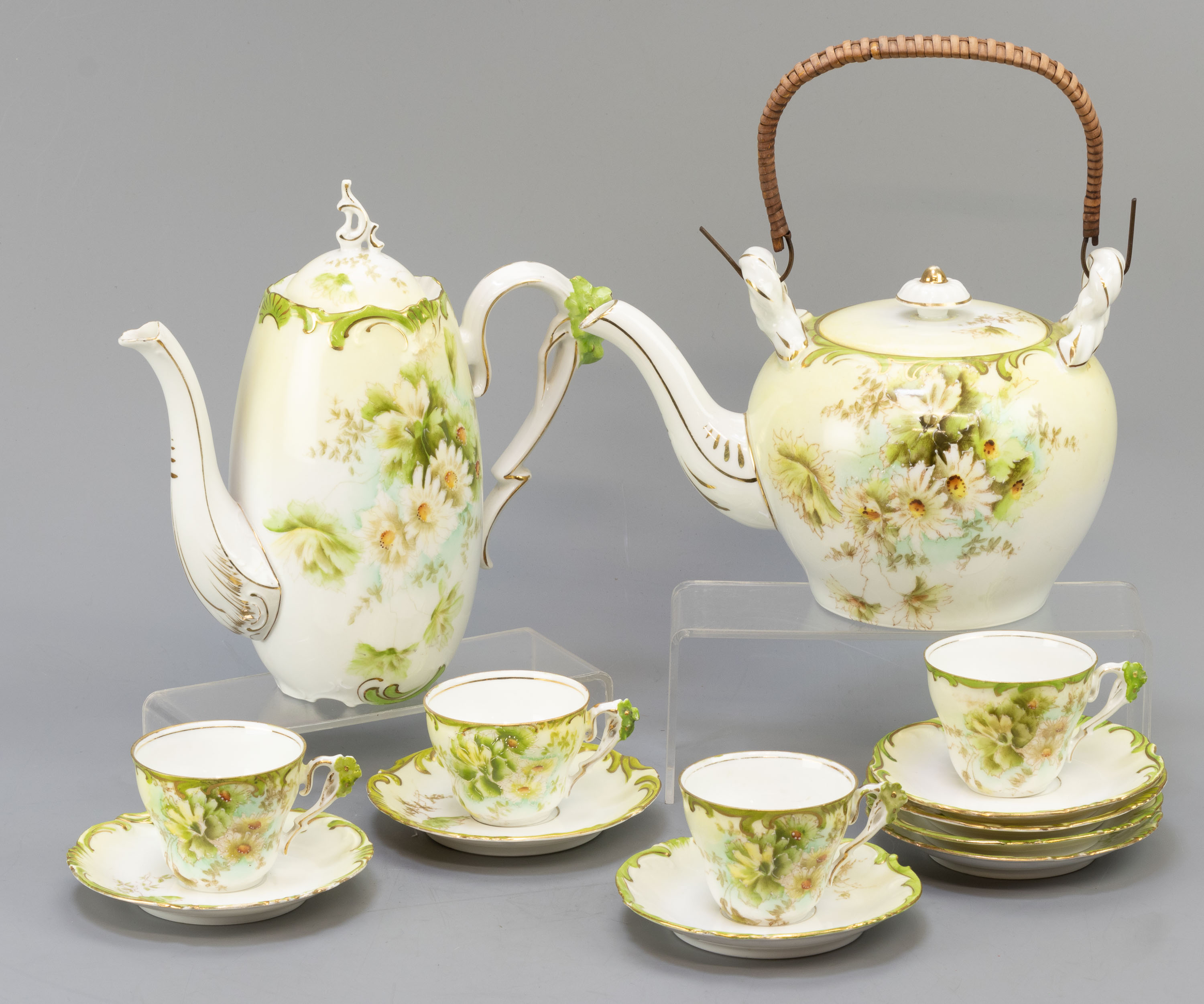 Porselein, groen en goudkleurig floraal decor, theepot, koffiekan, 6 schoteltjes en 4 kopjes.