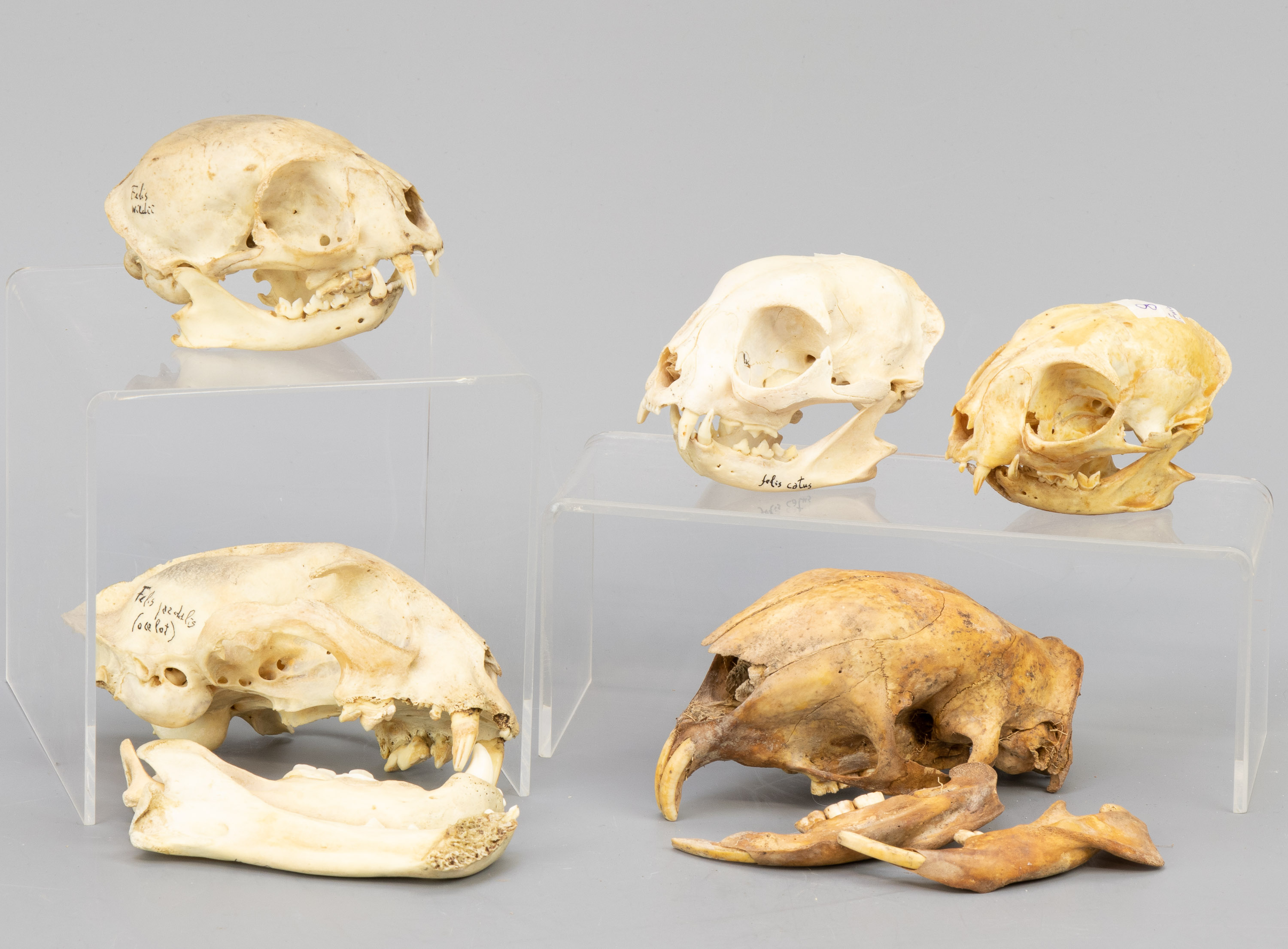 Felix pardalis, l. 15 cm, 2x Felix wiedii, Felix catus, Hystrix cristata, en daarbij een onderkaak van Felix concolor.