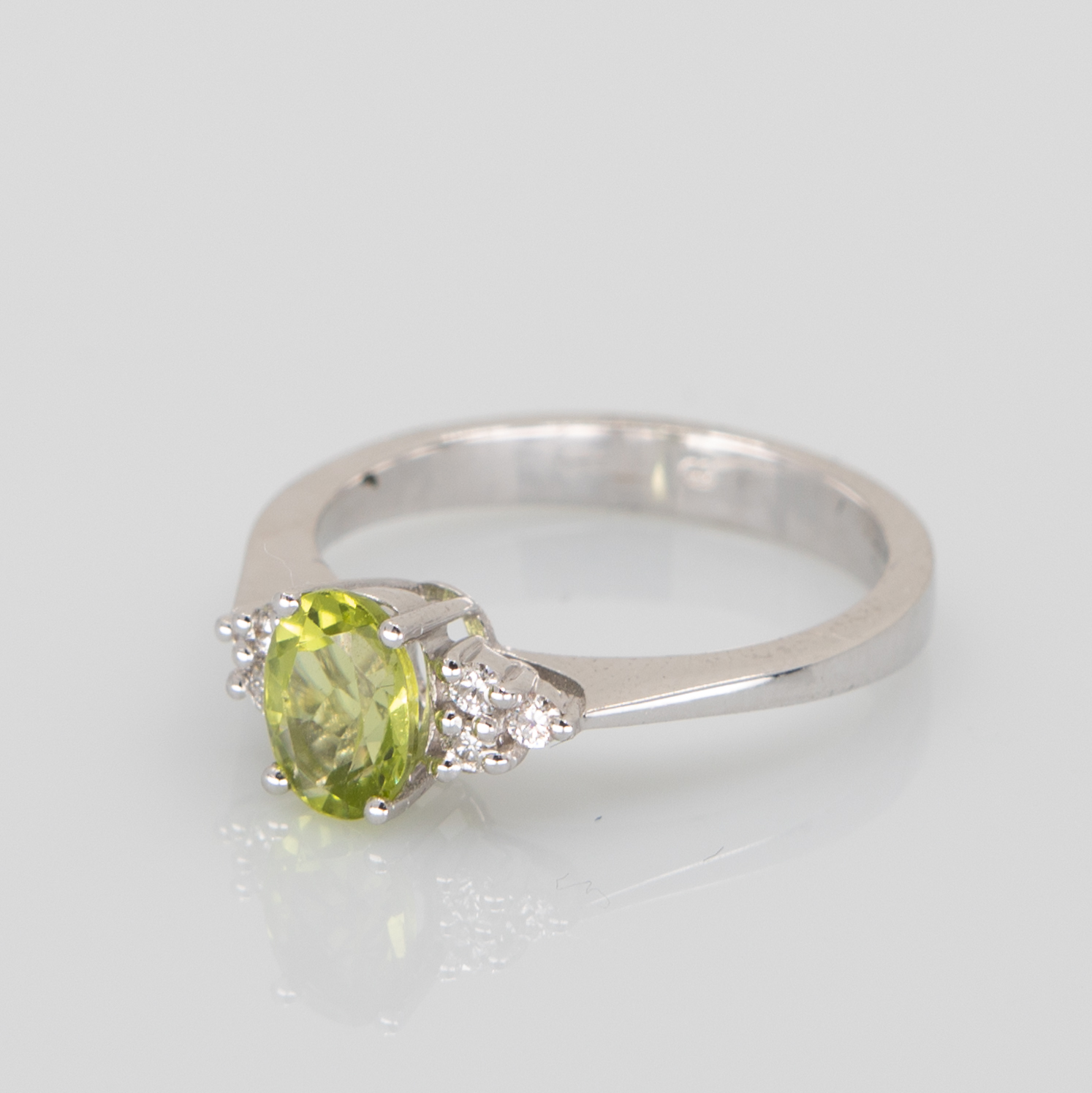 18 krt., centraal een peridot, aan weerszijde geflankeerd door 3 briljanten, tot. 0.11 ct. Si/P1 Top Wesselton, maat 17.25.