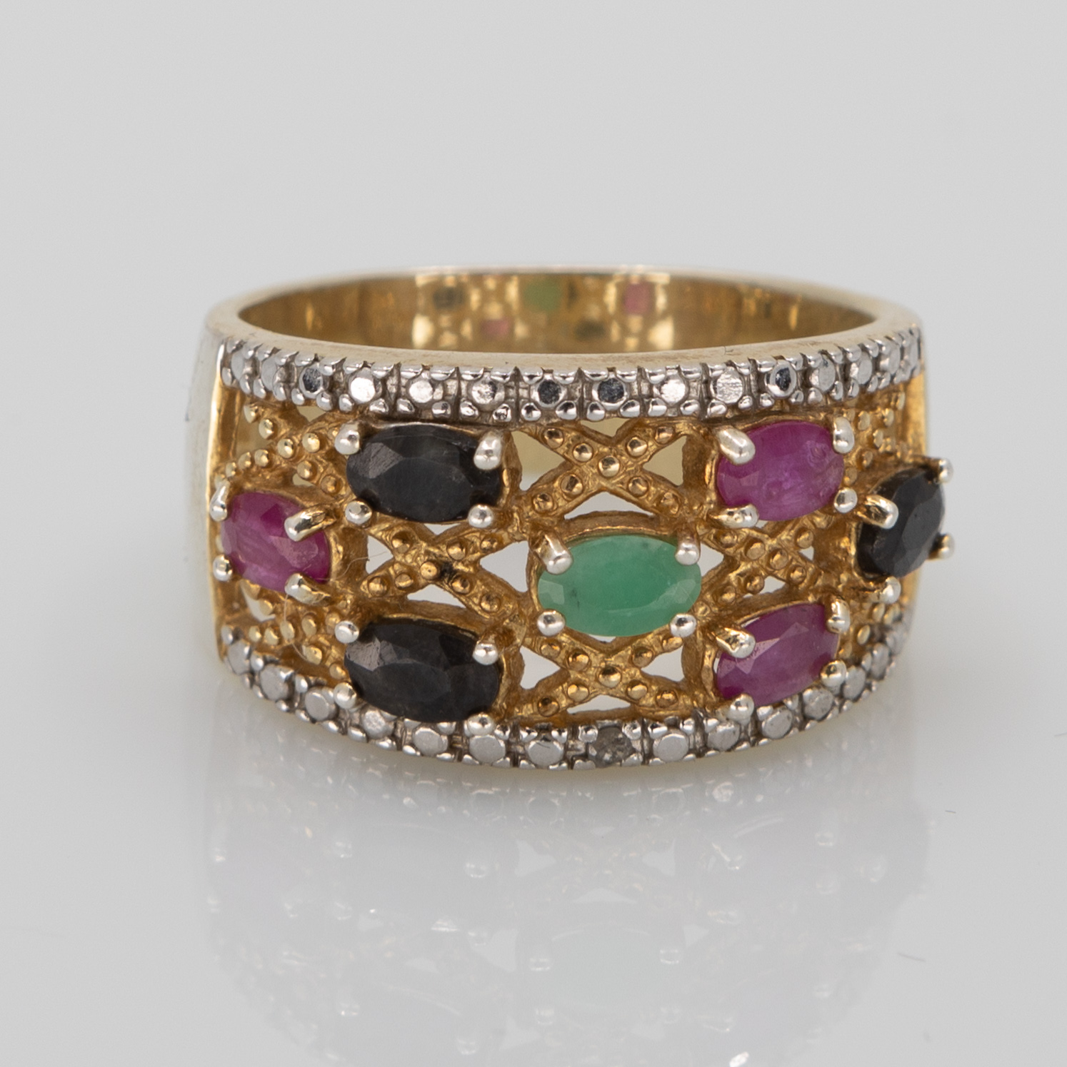 1e gehalte, deels verguld, in ajour zetting, bezet met ovale stenen, maat 20,25.
