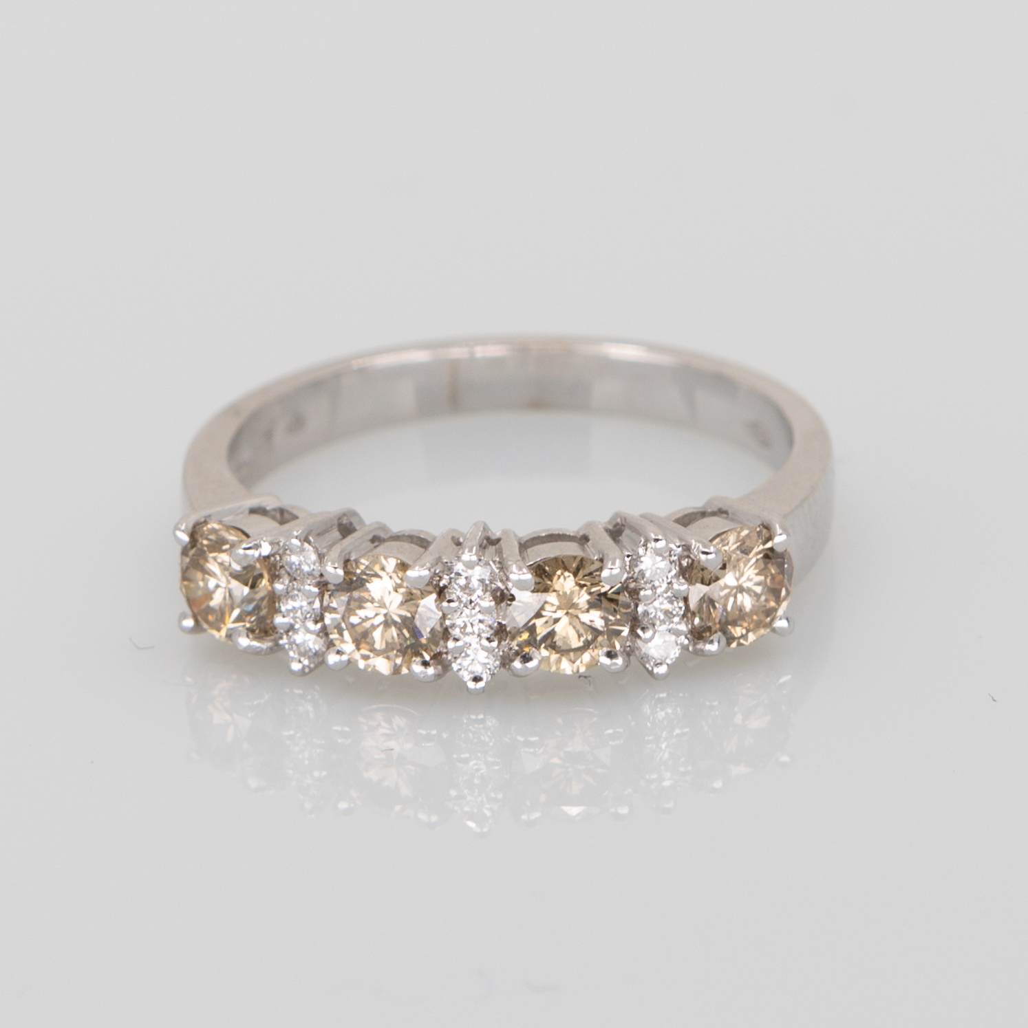 18 krt., bezet met 4 champagnekleurige briljanten, 0.93 ct., met daartussen 3 x 3 briljantjes, 0.13 ct. Si/P1 Top Wesselton, tot. 1.06 ct., maat 17.5.