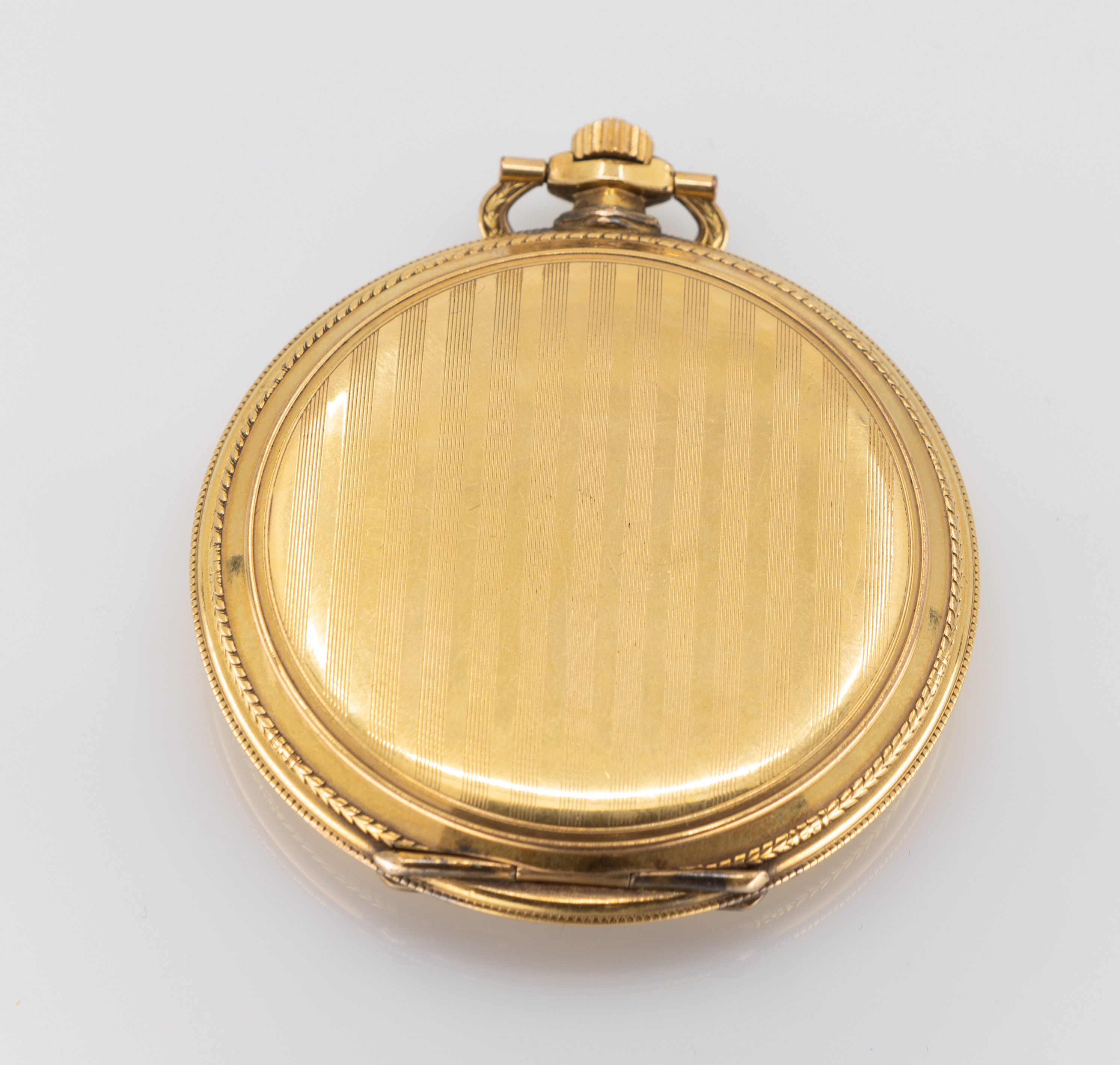 In vergulde kast, opwinder, voorzien van secondewijzer, de kast geribd en afgezet met kabelrand, h. 6.5 cm, in cassette - loopt.