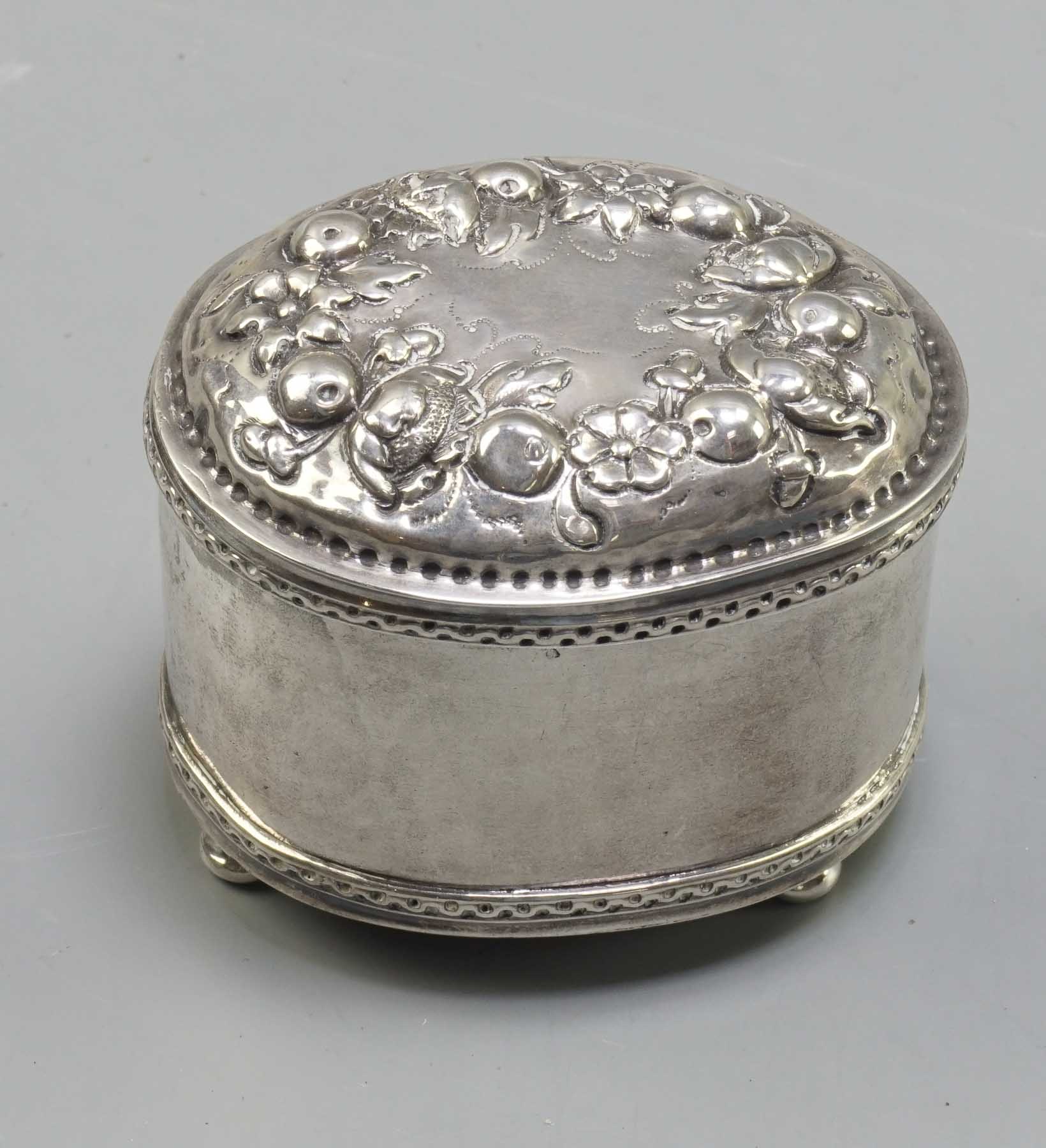 Van bloemen en vruchten, rustend op 3 bolpootjes, Bolsward, ca. 1680, h. 5 en l. 6.2 cm (solderingen aan pootjes). Afkomstig uit de verzameling van J.M. Goslings 1878-1954, afgebeeld op blz. 90 van de Christie's catalogus "Fine Dutch & Foreign Silver" d.d. 27 mei 1997).