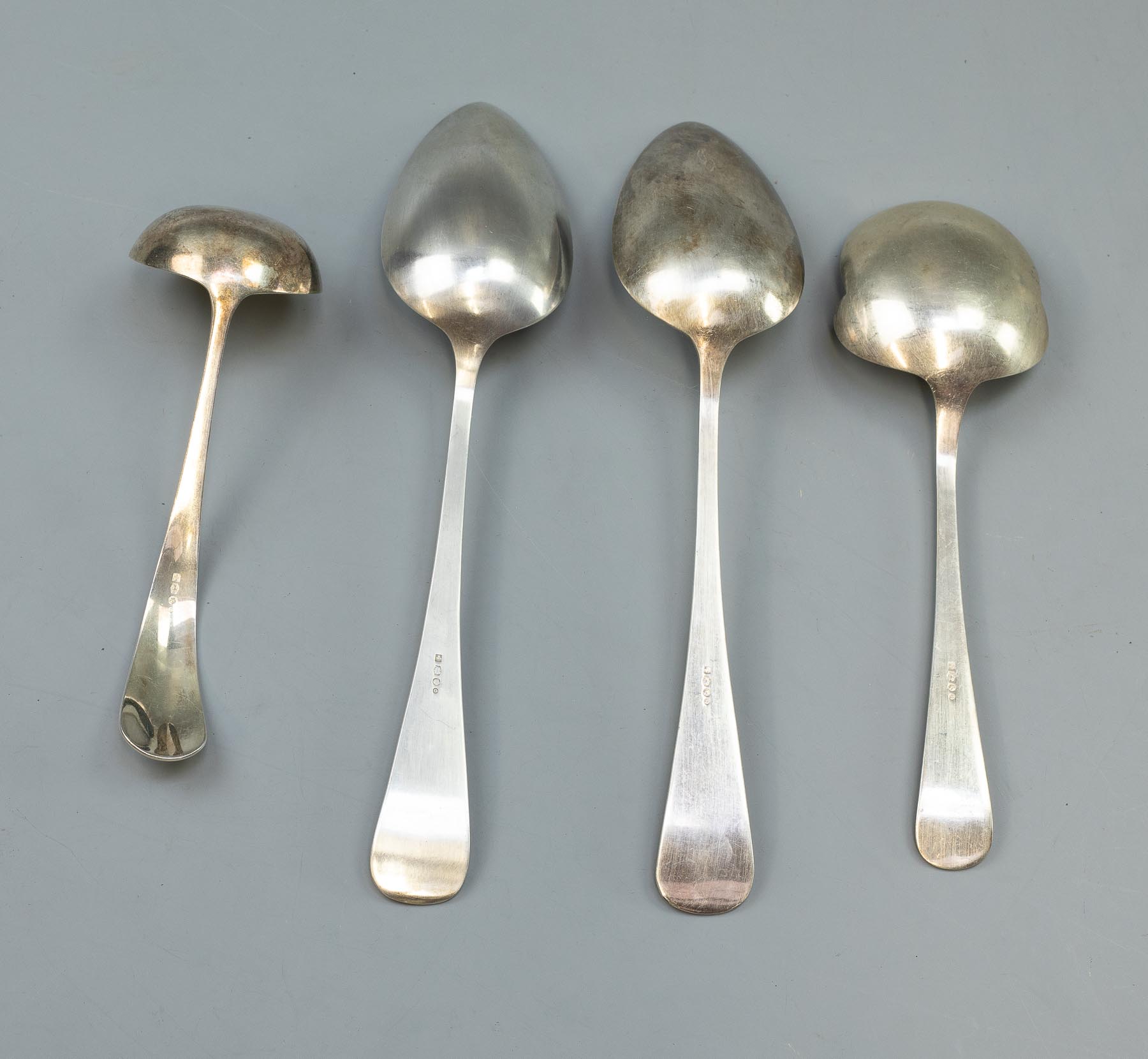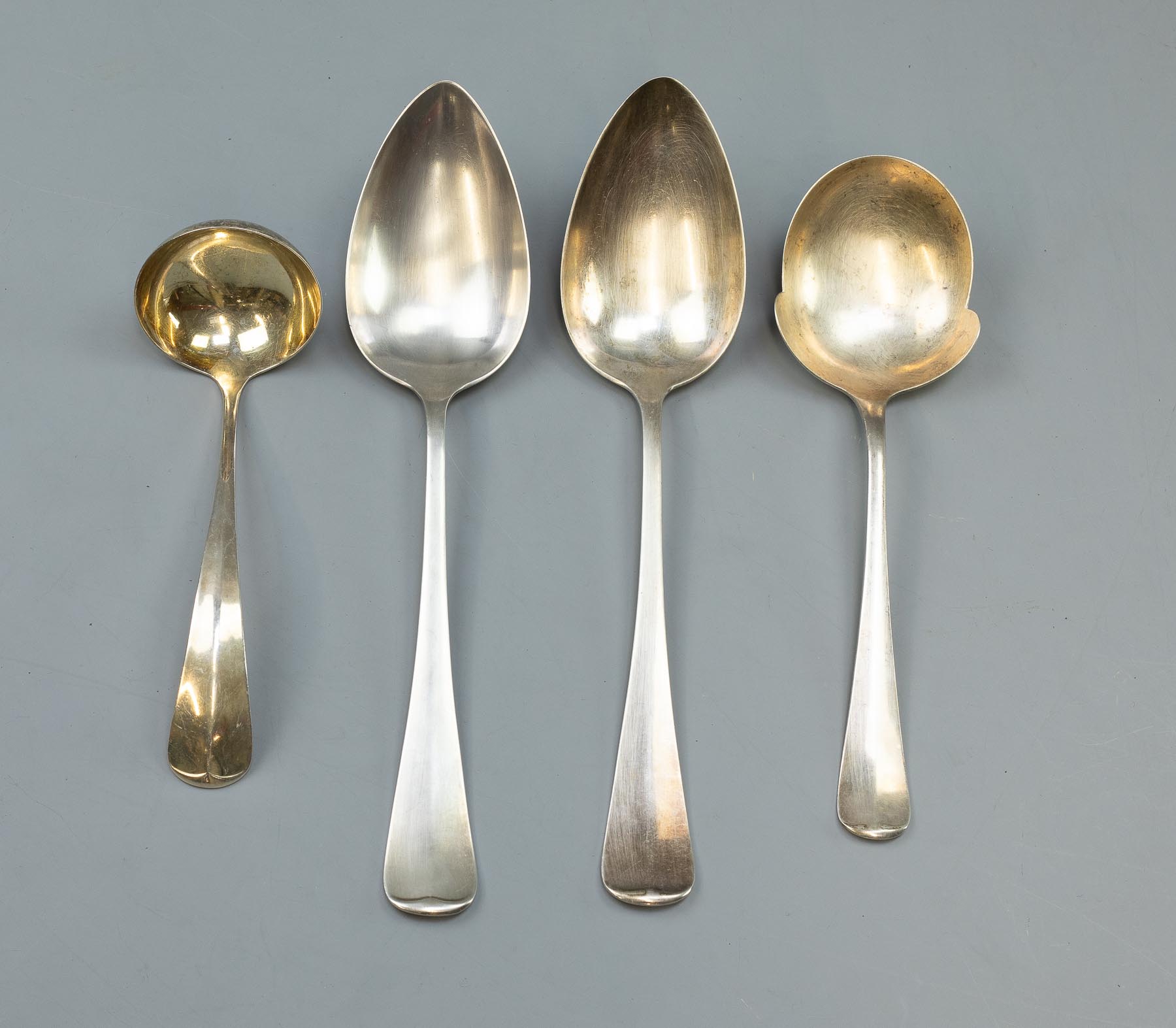 2e gehalte zilver, Zilverfabriek Fa. H. Hooijkaas, Schoonhoven, 1924-1929, bestaande uit een natfruitschep met fraai gestileerd zaagwerk, groentelepel, juslepel en aardappellepel, 326 gram.
