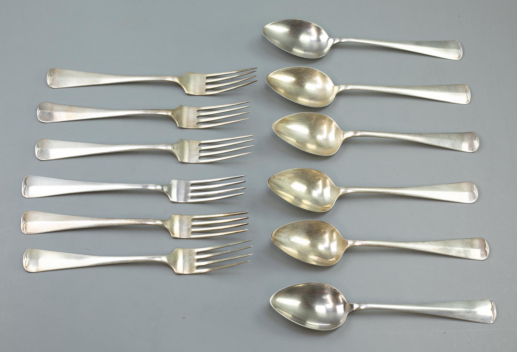 2e gehalte, 12-delig, 1 vork en 5 lepels Haags Lofje, 4 vorken en 1 lepel Hollands glad, eind 19e en vroege 20e eeuw, 446 gram (deels gemonogrammeerd).