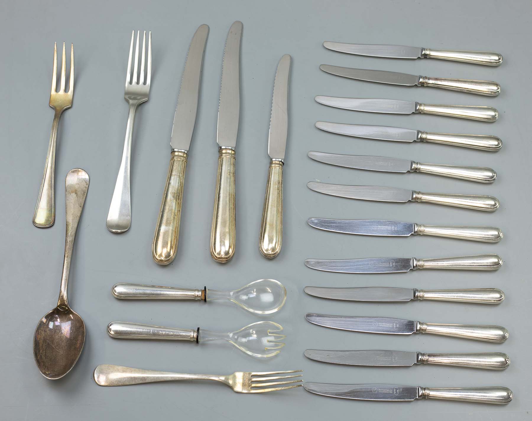 W.o. een 14-delig fruitbestek met rondfilet, Zilverfabriek Voorschoten.