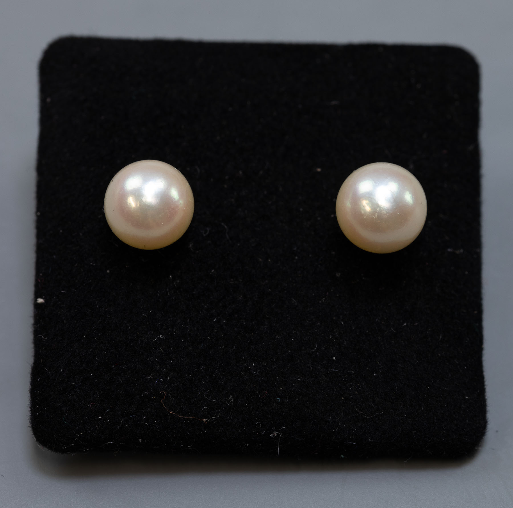 Witte cultivé zoetwaterparels, aan 14 krt. gouden staafjes, pouchettes niet origineel en niet goud.