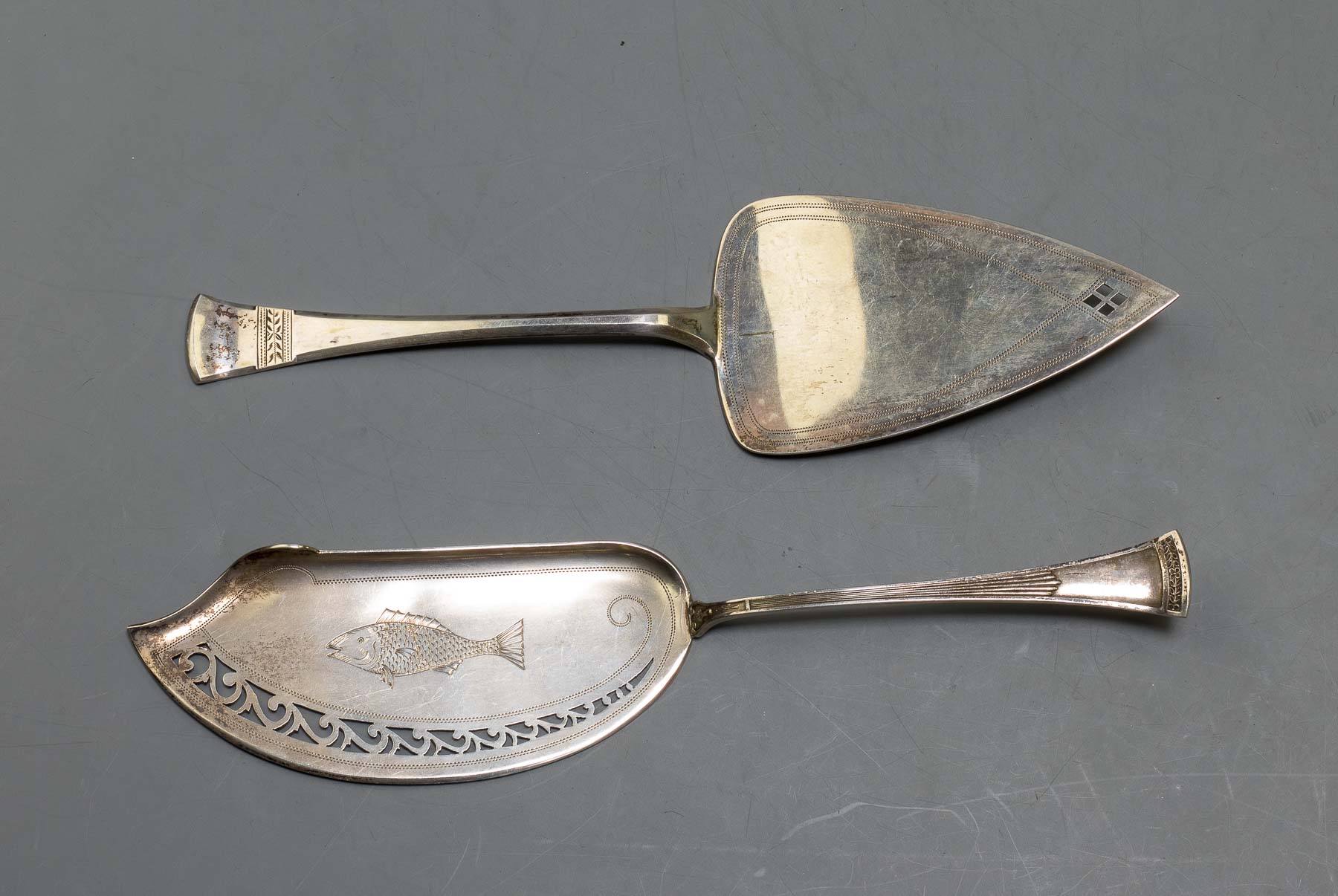 Beide 2e gehalte, beide met gestileerde sierrandjes, zaagwerk en uitlopend heft, taartschep,H.W. Moolenijzer, Holland 1912, visschep met gegraveerde vis, J.A.A. Gerritsen, Holland 1921, 195 gram.