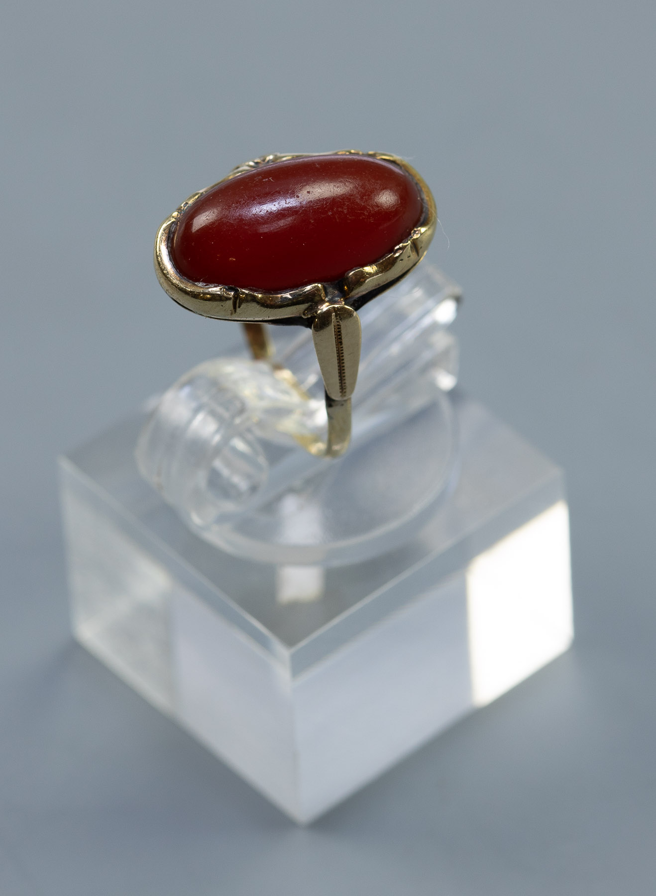 14 krt. geelgoud, 1 bezet met cabochon geslepen jade, maat 15.75, en 1 met cabochon geslepen carneool, maat 16.