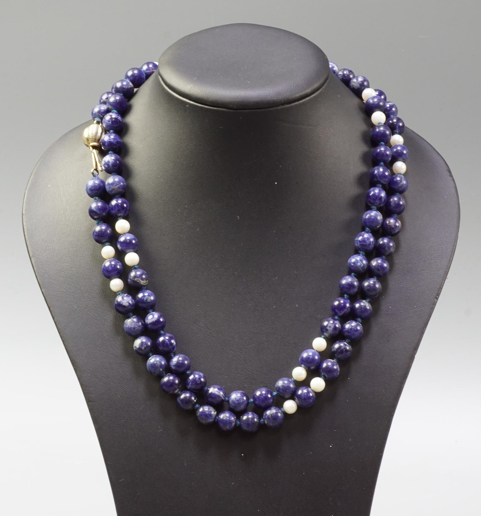 Lapis Lazuli kralen ca. 8 mm, om de tien kralen afgezet met een kleine witte parel, vervolgens een lapis kraal waarna weer een pareltje volgt, 14 krt. geelgouden sluiting, l. 87 cm.
