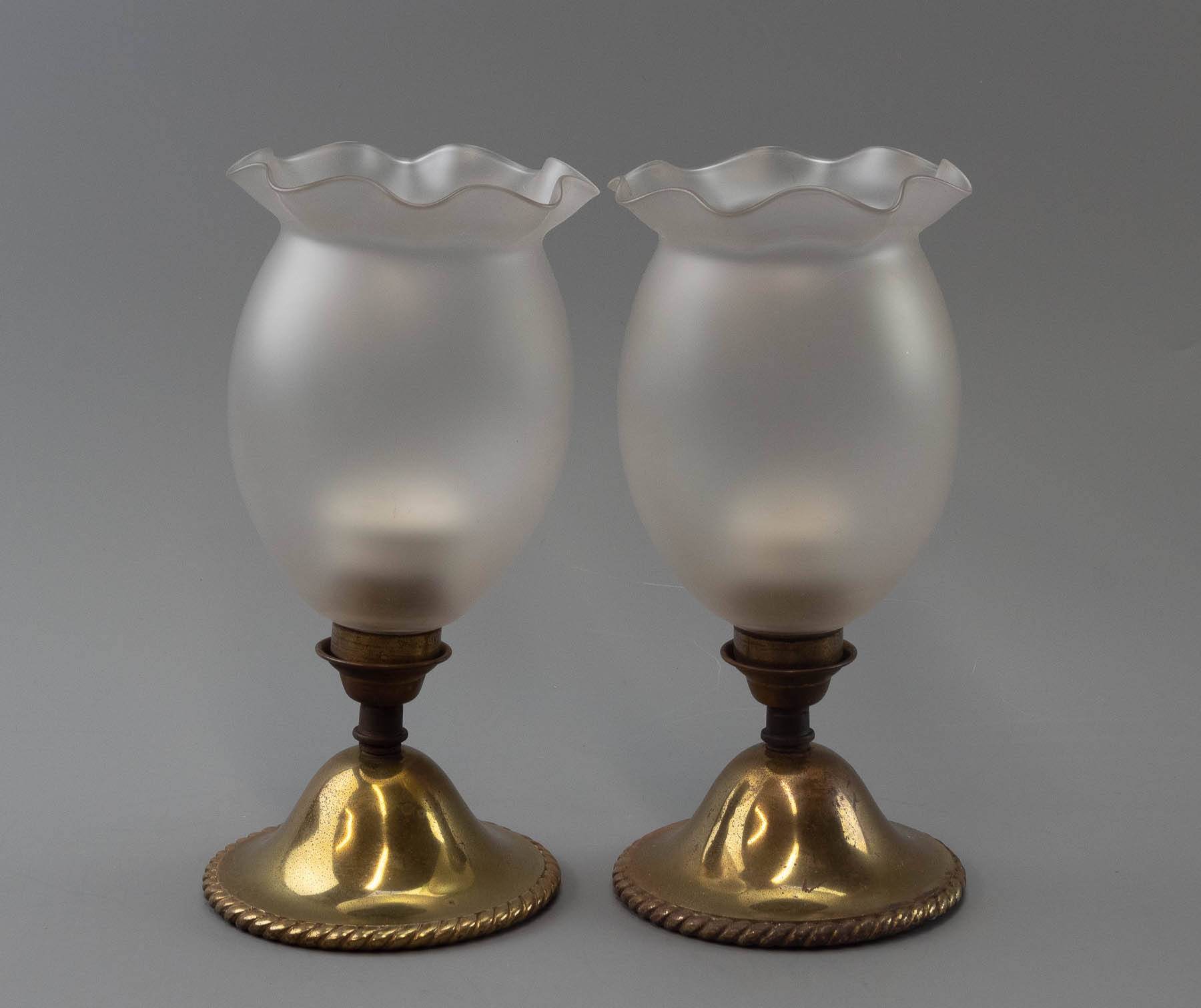 In messing monturen afgezet met kabelrand, met gesatineerd glazen kapjes en porseleinen vittingen, ca. 1900, h. 24.5 cm.