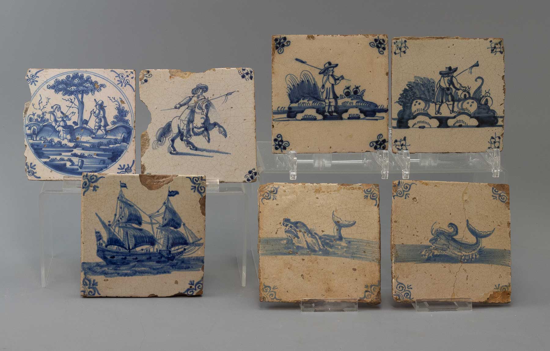 Twee medaillontegels met Bijbelse en mythische voorstelling, 5 landschapstegels, 2 tegels met schepen, 2 met zeewezens en 3 maal met figuren, 17e-19e eeuw (defecten en restauraties).