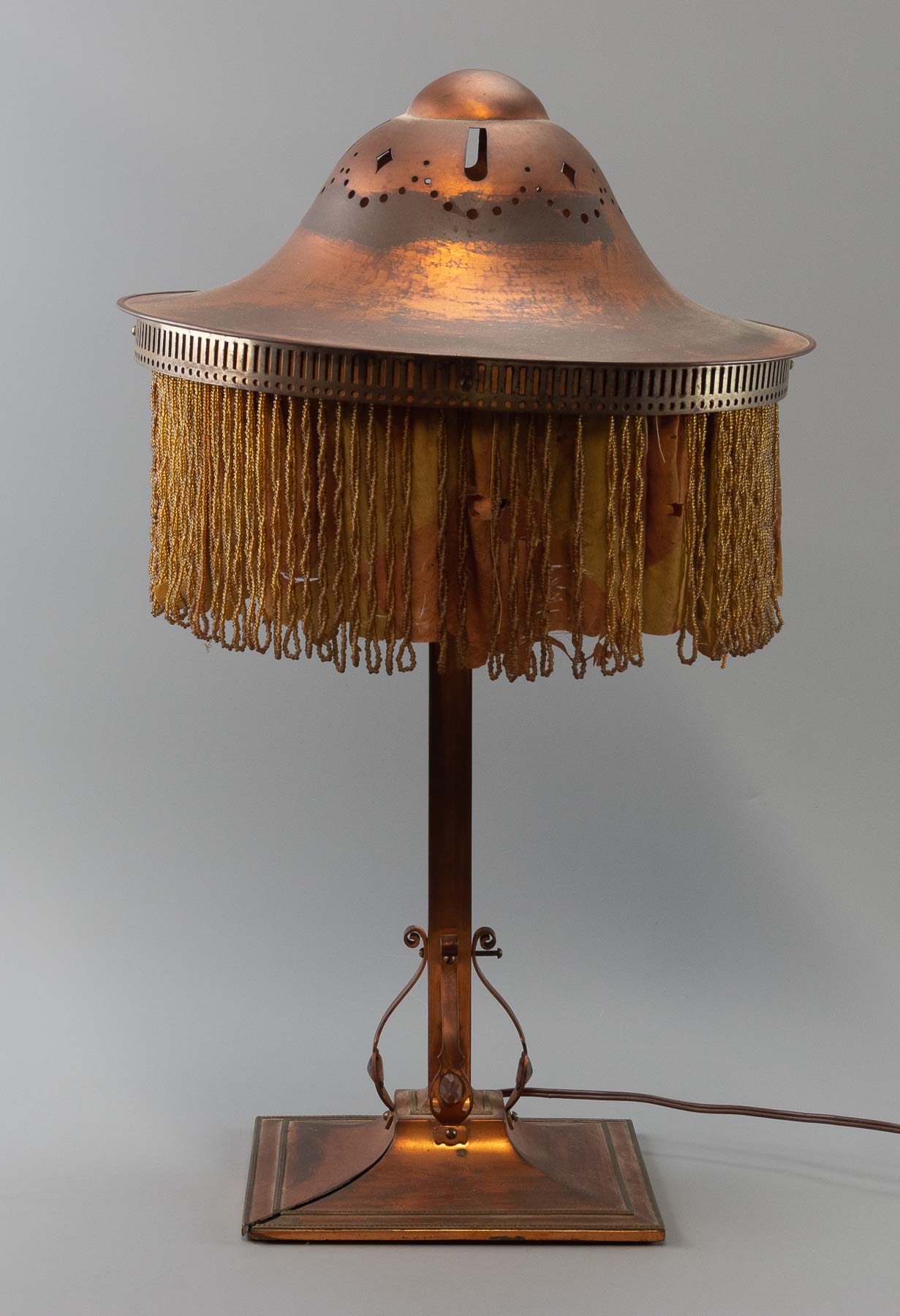 Roodkoper, de kap versierd met origineel stof en kralenstrengen, h. 54 cm.