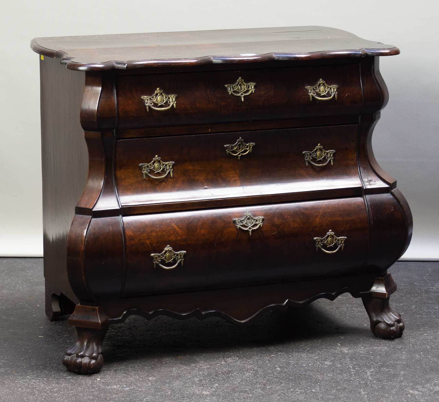 Mahoniefineer op eikenhout, buikgebogen, rustend op klauwpoten, h. 78 x b. 90 x d. 49 cm.