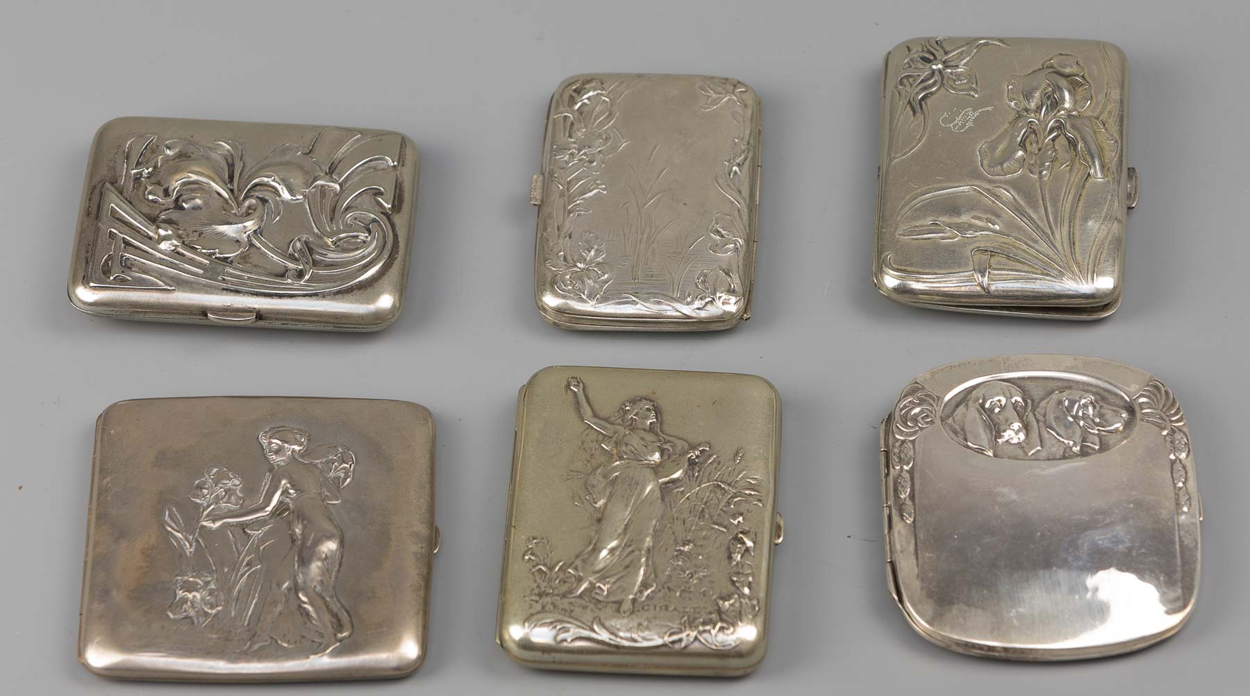 Met Jugendstil reliëfdecors van o.a. een dame tussen bloemen, florale motieven en zweepslagen, alle einde 19e/vroege 20e eeuw, max. 8.5 x 8 cm.
