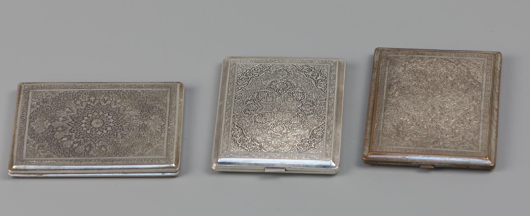 2e gehalte, 1 met reliëfdecor van danser en verso inscriptie: "The Government savings bank of Thailand," 1 met niëllodecor, en een 1e gehalte met landschapsdecor en inscriptie "R.B. Jackson Esq. from Chom Swee Honq" Thailand, midden 20e eeuw, max. 11.5 x 9 cm.