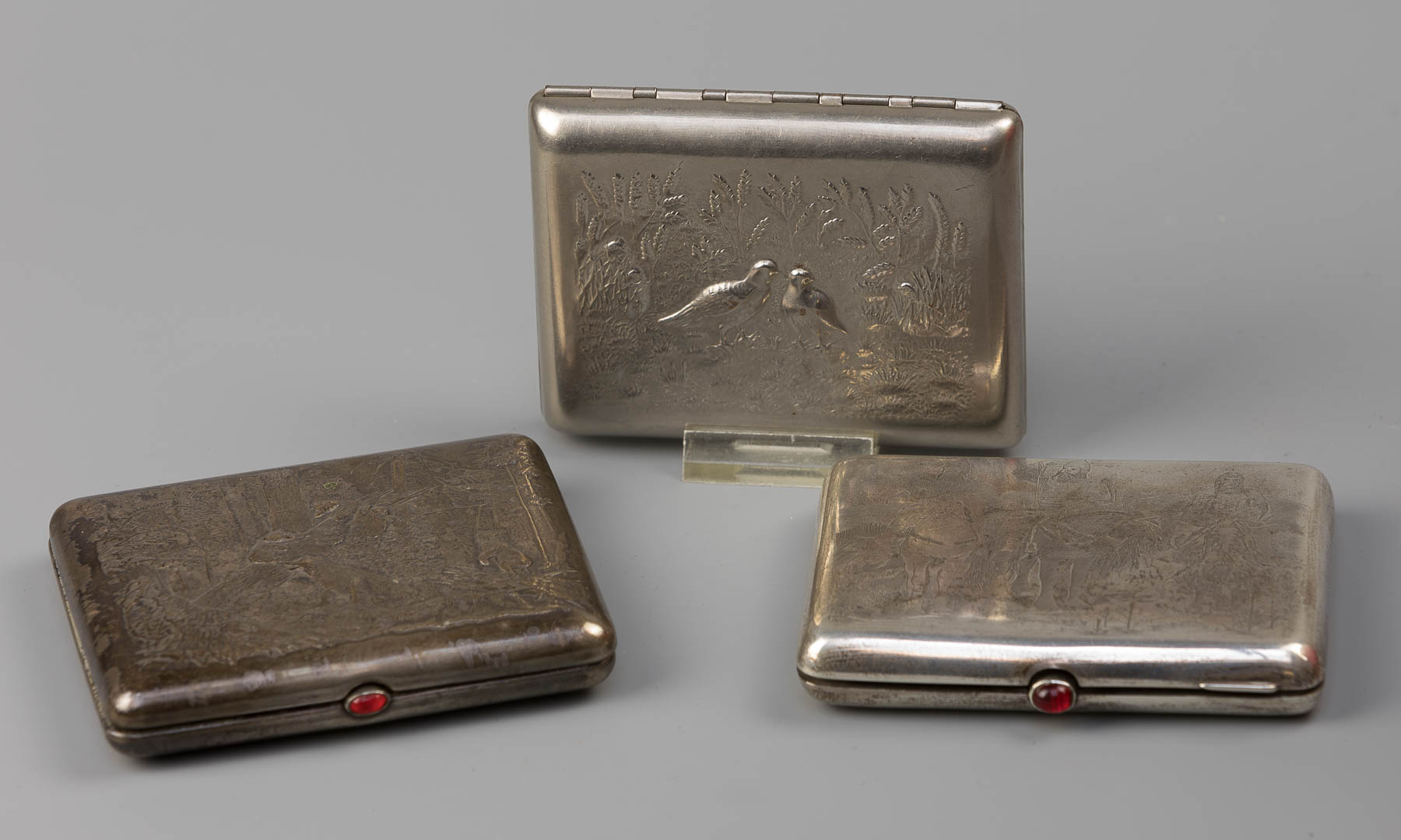Twee met gedreven decors van rustende jagers en beren in het bos, en 1 3e gehalte zilveren exemplaar met gravédecor van "De Drie Bogatyrs", naar het schilderij van Victor Vasnetsov, Sovjet Unie, midden 20e eeuw, max. 11 x 9 cm