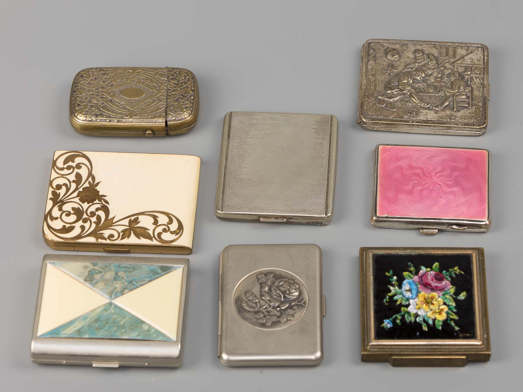 Diverse materialen en decors, w.o. geëmailleerde florale motieven, daarbij een visitekaarthouder en 1 pillendoosje.