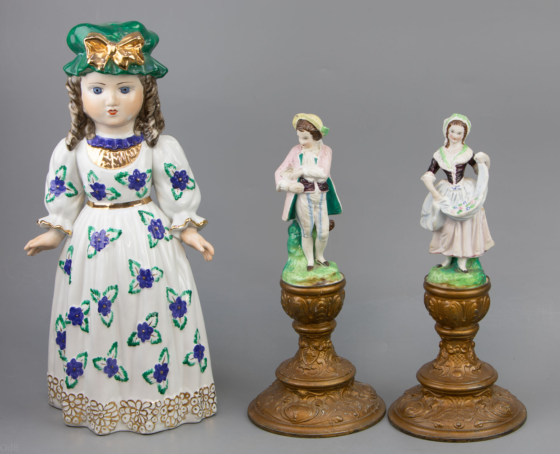 Een meisje in bloemenjurk, gemerkt met gekroonde N, en een paar biscuitporseleinen beeldjes van dame en heer op zinklegering voet, h. 28-36.5 cm.