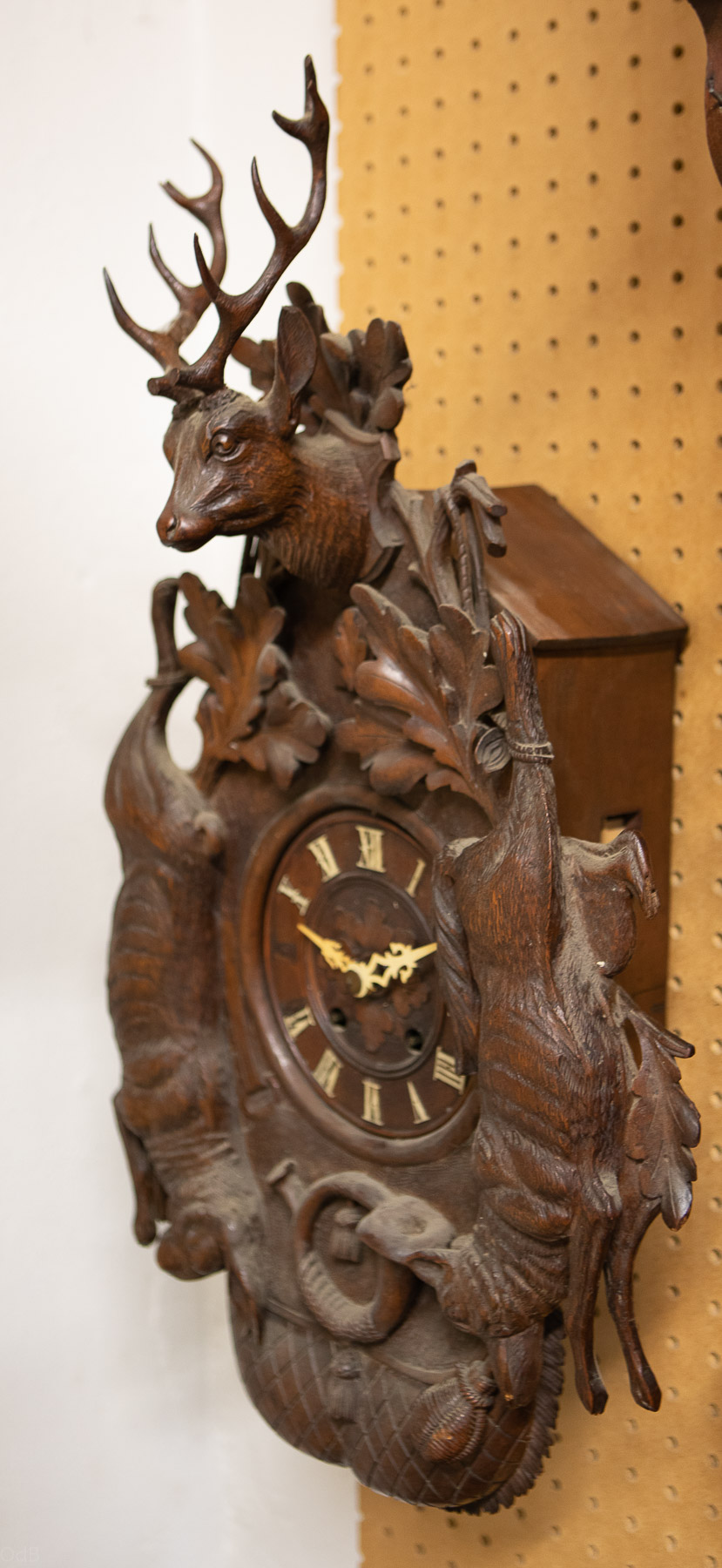 In houten behuizing, met jachtdecor, h. 62 cm - gewei gelijmd en manco's wijzerplaat.