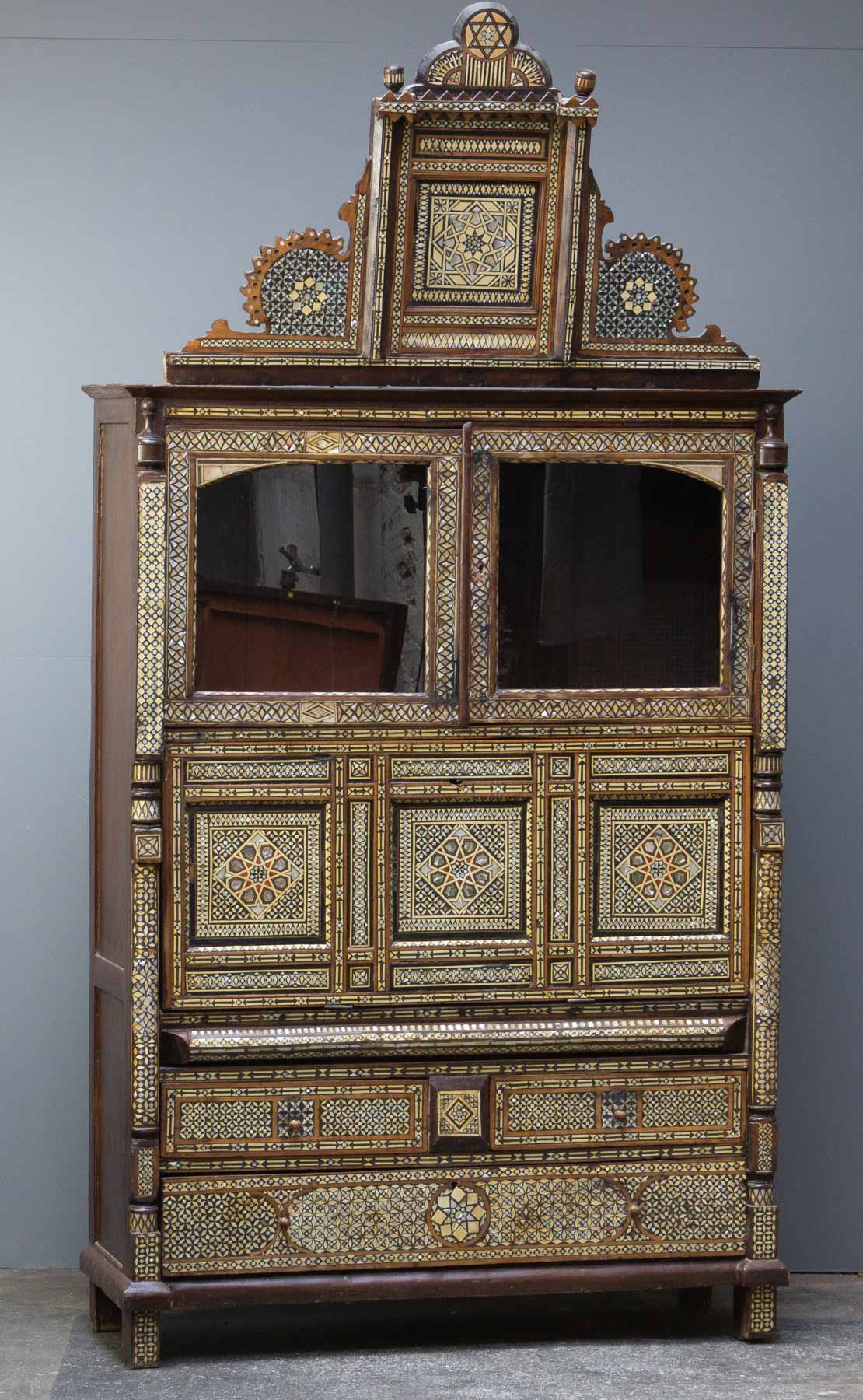 Ingelegd met parelmoer en been, met geometrische motieven en in de (afneembare) kuif een Davidsster, op 3-laads onderstel, waarboven een klep en 2 (later) beglaasde deurtjes, h. 175/243 incl. kuif x b. 126 x d. 46 cm.