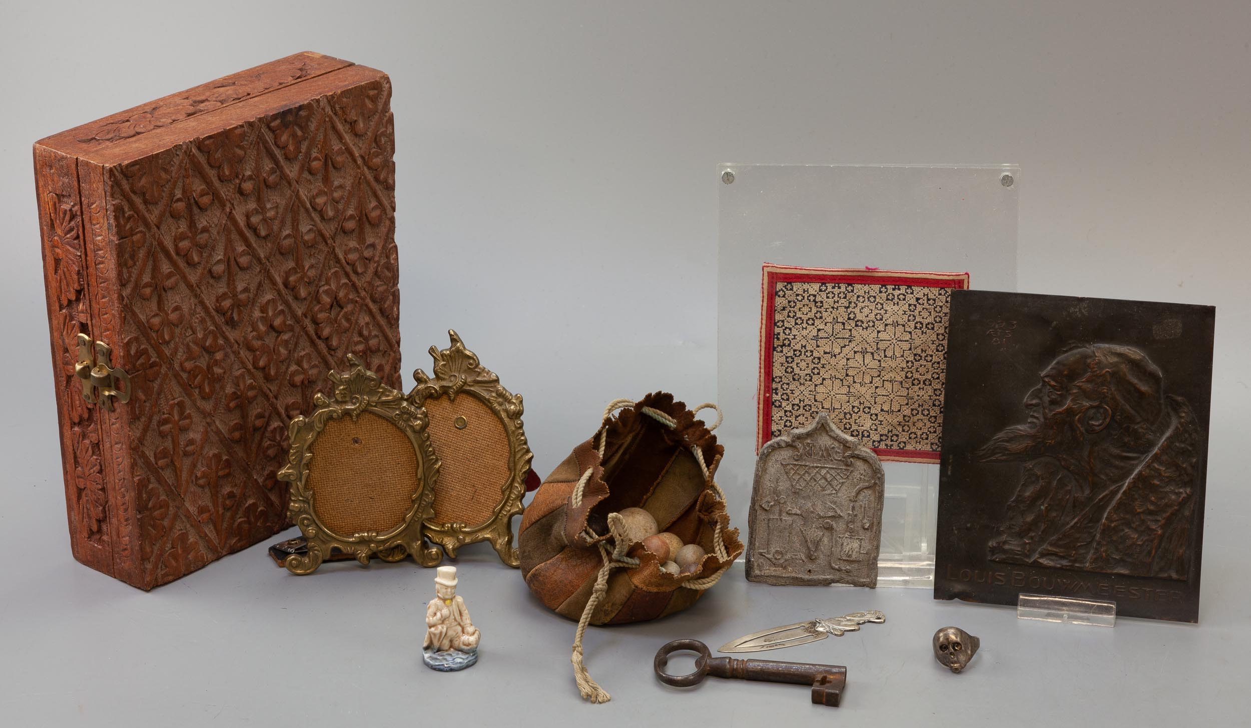 Bestaande uit knikkers in leren etui, 2 messing fotolijstjes, een plaquette van Louis Bouwmeester, een textielfragment, een zilveren boekenlegger bekroond door een zittende dame, een ring met doodshoofd, etc.