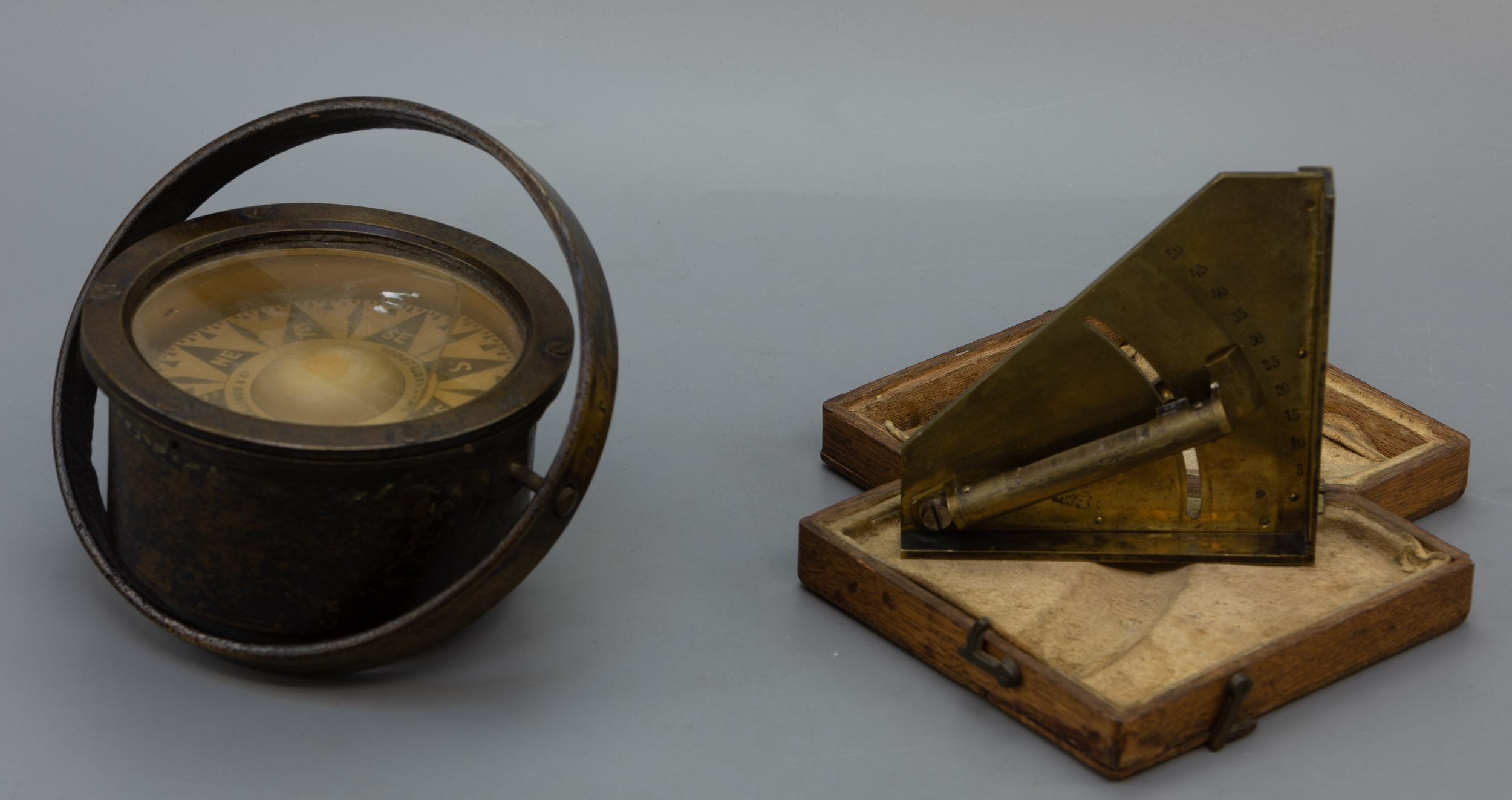 Koper, cardanisch opgehangen, ø 16 cm, waterpas in messing kast en houten kistje, 16 cm.