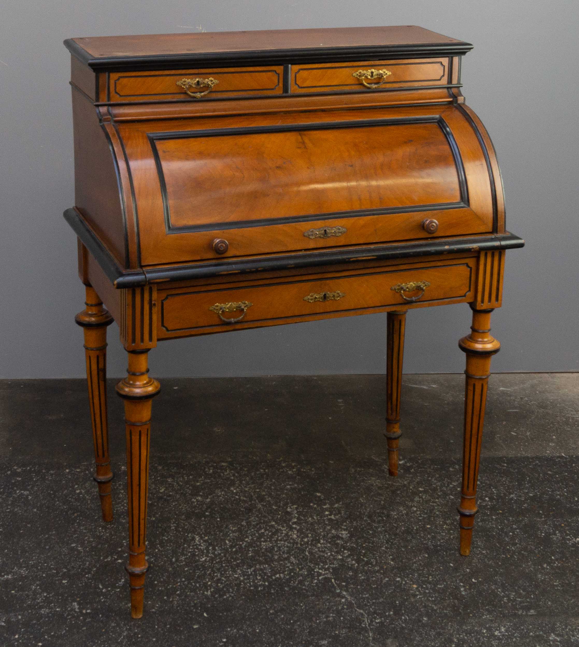 Mahoniefineer op eikenhout, gecontourneerd uitklapbaar blad waaronder een opbergvak en één lade, maten in ingeklapte toestand: h. 74 x b. 75 x d. 40 cm.